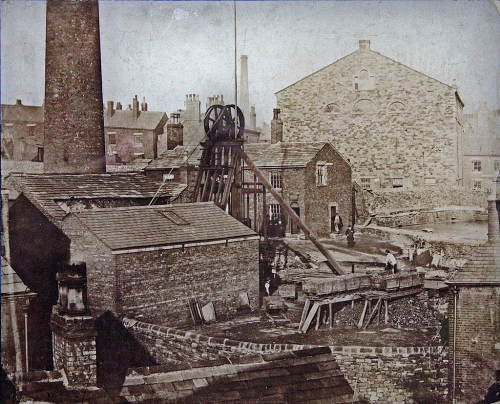 The photograph shows Fairbottom Street in the second half of the 19th century. The base of the colliery chimney stack was later covered up by the front stalls of the Kings Cinema, which was built in 1911. The pit shaft is also now under buildings. The large building in the background, is the back of the Theatre Royal on Horsedge Street. The Coliseum, which was built in 1887 would appear later on the extreme right of this view.