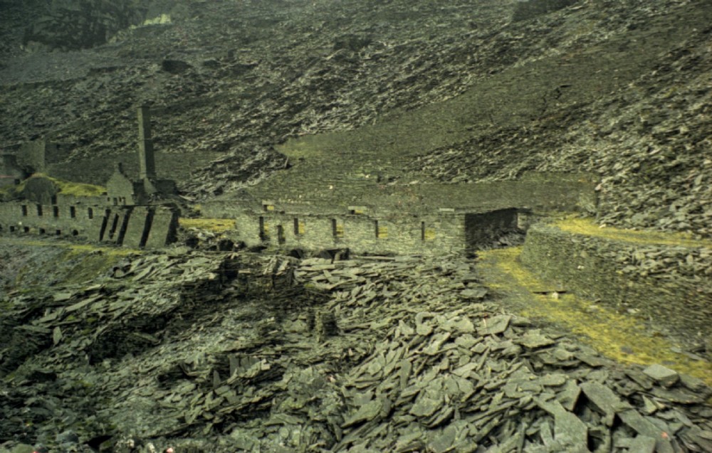 A very noticeable chimney stack and engine house, along with the buttresses supporting the centre section wall. The upper level tramway was constructed in the 1880s to connect the mill with the Middle Quarry mills (Gloddfa Ganol)