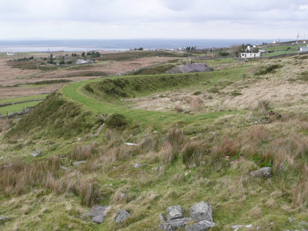 Looking down on the course of the tramway. The curved embankment in the foreground leads the track away downgrade through a further series of curves to Drumhead, just off picture to the left. The trackbed can be seen above the roof of the derelict building in the foreground. Wicklow Hills on the horizon, top left.