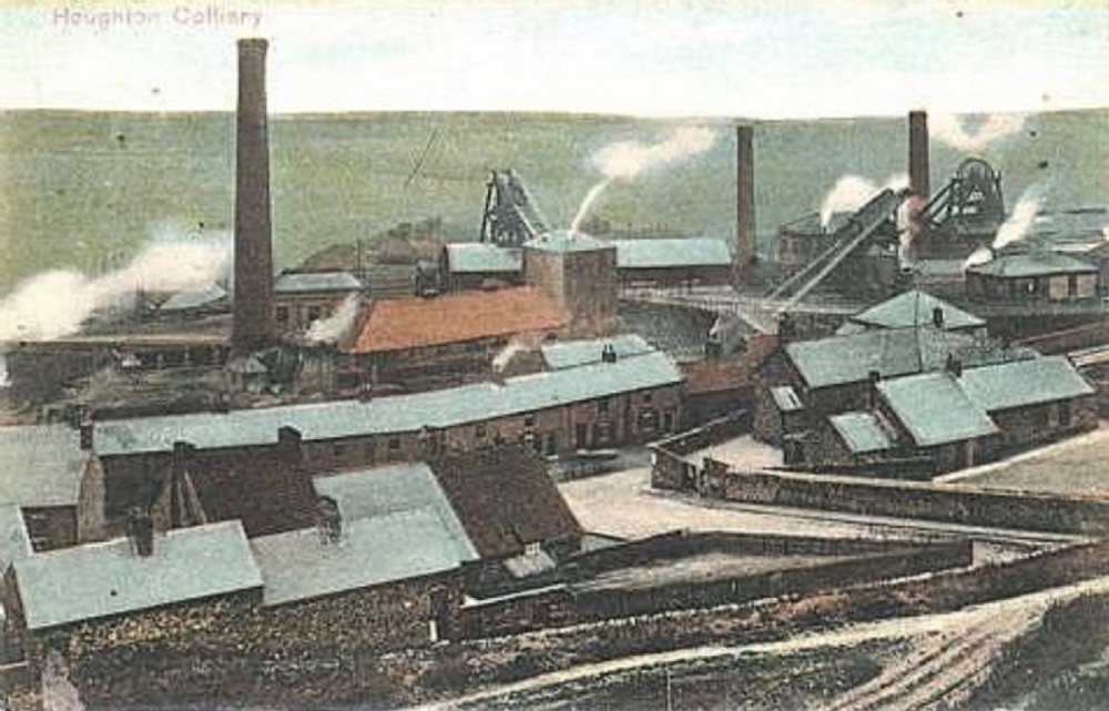 Looking west, with the upcast (North pit) shaft on the right and the downcast shaft on the left (south pit), which in this picture shows a Vertical type Winder similar to the one at Beamish Museum, in the future it will receive a new headstock facing the opposite direction and a new winder House. Whilst the upcast shaft looks similar to pictures just before it closed but will more likely be modified or even a new Headstock? The winding wheel for instance looks huge in this picture but will be tiny in later ones. The majority of the main buildings in the lower half of this scene lasted until the 1980s but were mostly cleared away when the mine closed. note the row of housing that backed onto the pit yard, like most Collieries of this age the shafts were situated close to a main road (Houghton to Newbottle A182) but its buildings will eventually spill out over the main road. The buildings lower left is now occupied by Houghton Comrades club and Houghton car sales, whilst to the right below the north shaft is now Tyrespot.
