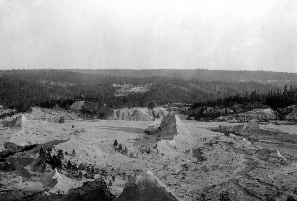 Hydraulic mining pits at North Columbia, The pit in the foreground is known as "The Consolidated"; in the distance, at left, is the "Union Diggings"; at right the "Sailor Flat" nine. Nevada County, California, n.d.