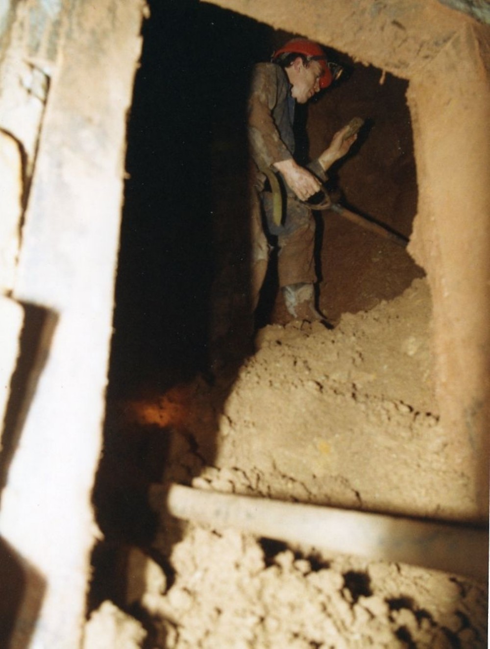 Malcolm one of the DCC diggers examining a find inside the rebuilt Bear pit ore chute, circa 1987