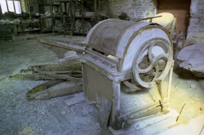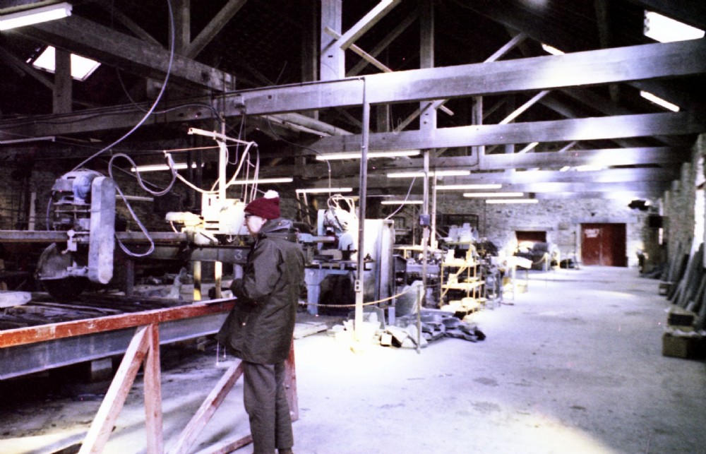 A view along the public walkway at the side of the mill. The mill was originally a slab mill, rather than a dressing mill and had overhead rails for carrying extra-massive slabs to and from the saws. It had had a pair of Hunter Saws, but those were long gone.