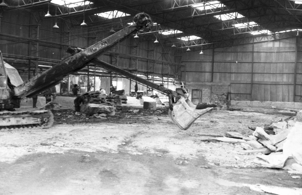 The excavator extracts another from the pile.