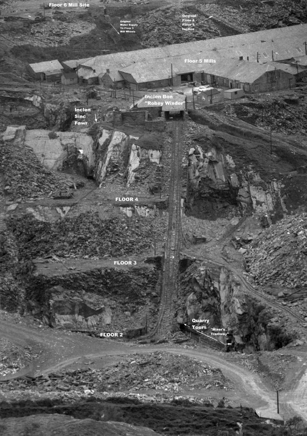Taken from Cribau, this view shows the exposed extent of the "Inclen Bon" or Robey Incline from Floor 5 down to floor 2 - it certainly extended below this in the past at least as far as floor 1, if not lower. Paralle to it, and worked by the same drumhouse, via the sheave on floor 5 was the "Inclen Sinc Fawr"