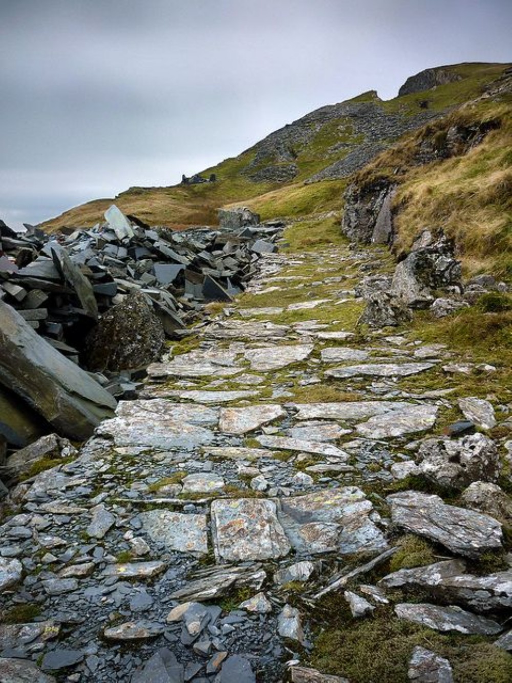 The quarry is seen as a jagged edge against the hill. Below is a partly blocked short entrance adit.