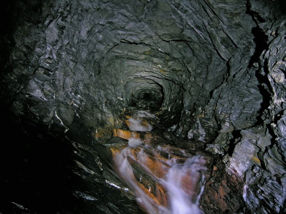 The incline floor has been eroded back to the bare rock by the passage of water through the mine.