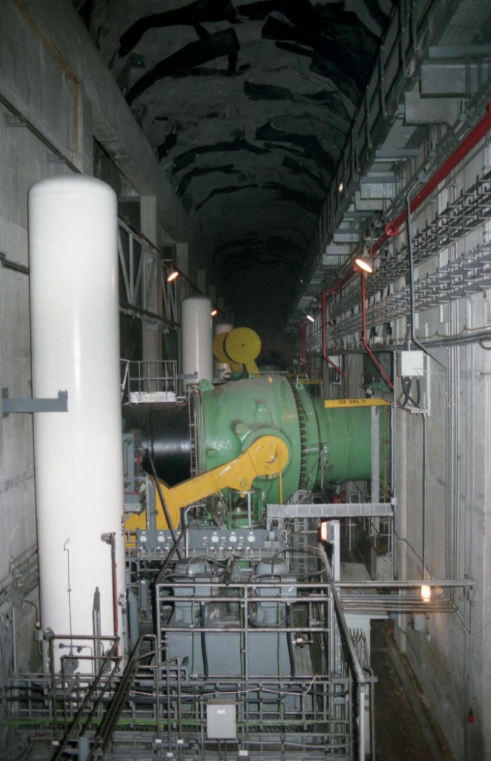 These are the high pressure inlet valves in their mined chamber deep in the mountain. The nearer valve is shut the one beyond it is open. The yellow weights are raised by hydraulic power and closed by their own weight, the hydraulic rams acting as dampers/dash pots.