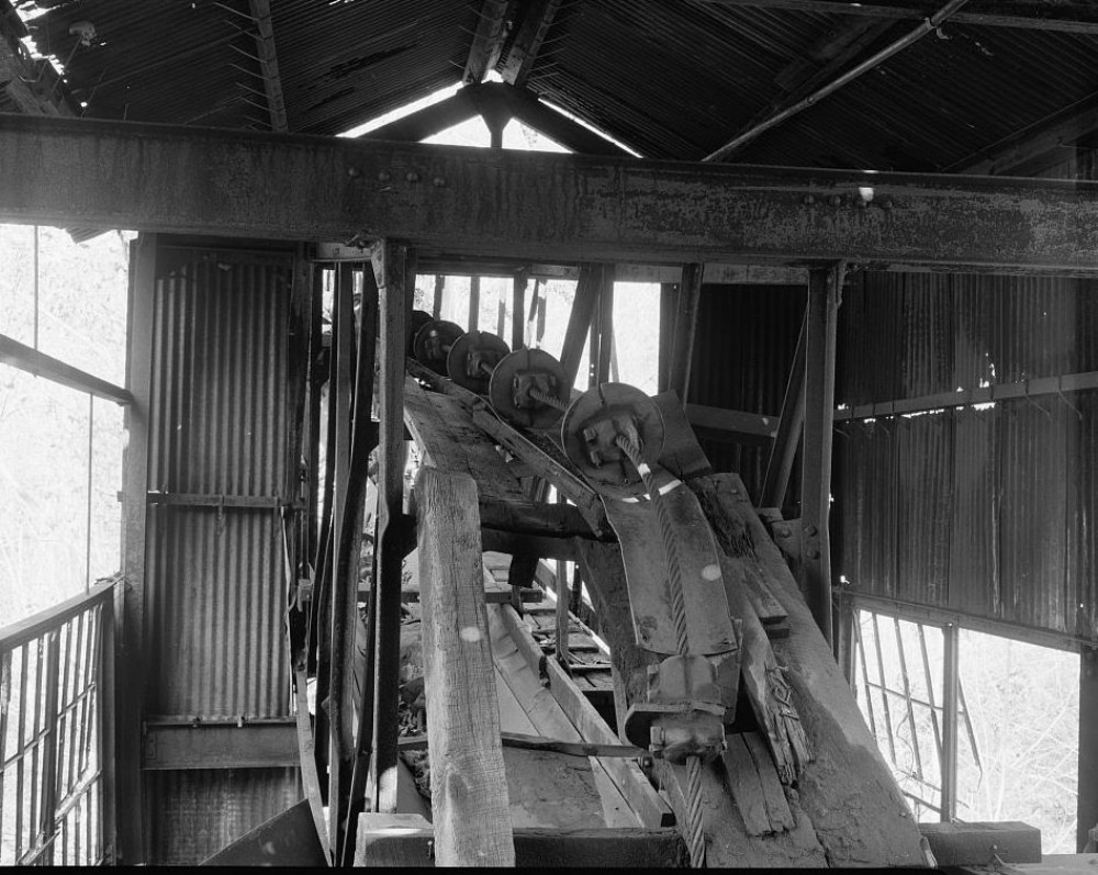 INTERIOR, DETAIL OF RETARDING CONVEYOR, SHOWING CAST IRON BUTTONS AND STEEL ROPE IN UPPER TROUGH IN CONVEYOR HOUSE, LOOKING NORTH; NOTE STEEL PLATES LINING WOODEN TROUGH.