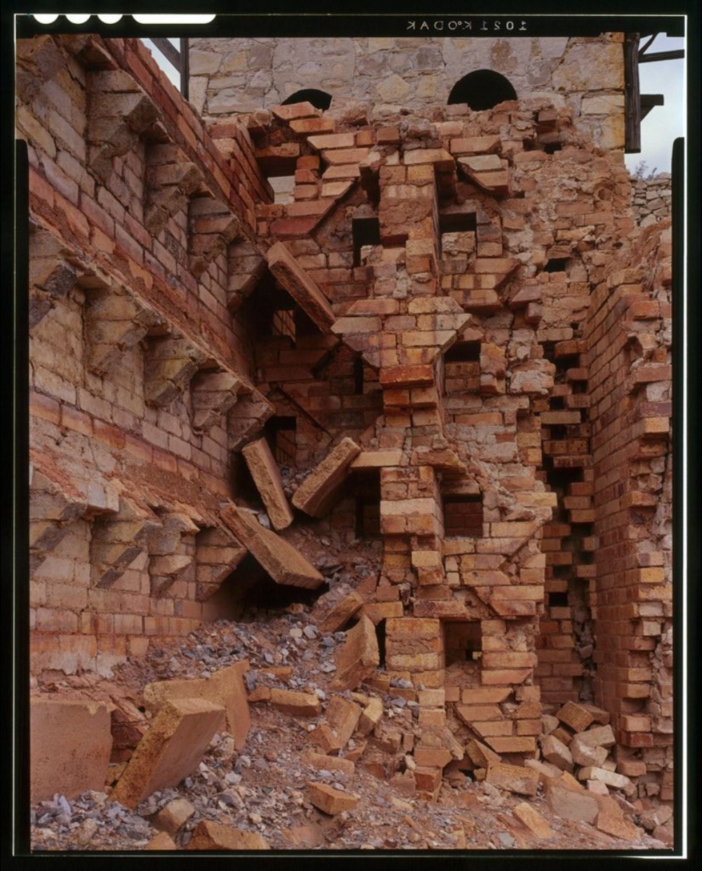 DETAIL VIEW OF SCOTT FURNACE SHOWING INTERIOR SHAFTS AND PIGEON HOLES, LOOKING SOUTHWEST.