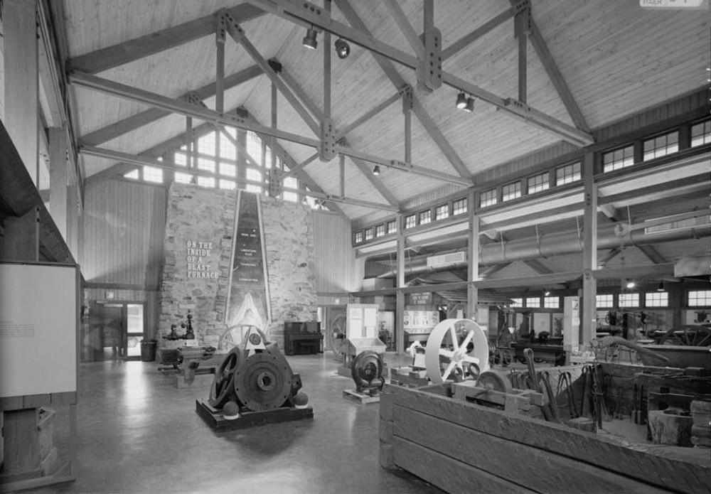 INTERIOR VIEW SHOWING DISPLAY OF INSIDE OF BLAST FURNACE AND MACHINERY AND ARTIFACTS INCLUDING A STEAM ENGINE HUB MADE AT THE BRIERFIELD ROLLING MILL (INSCRIBED C.C. HUCKABEE AND DATED 1863) AND OTHER STEAM ENGINES.