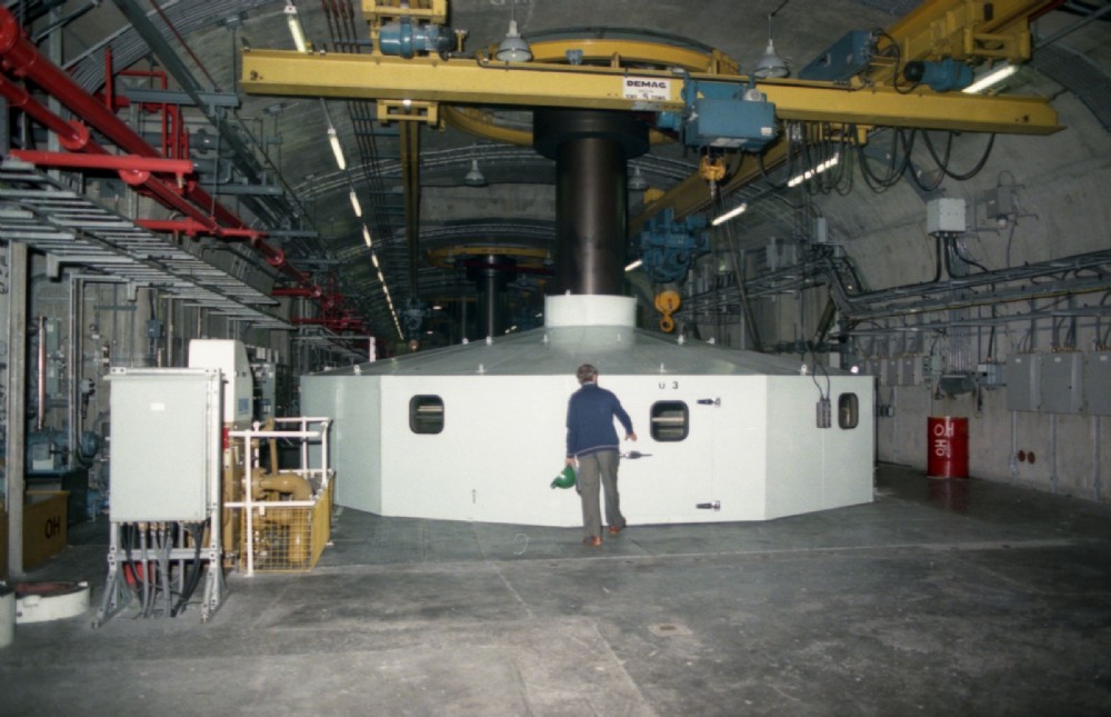 the white thing is the acoustic hood covering the pump/turbine - the actual alternator/motor is in the "roof" between this gallery and the machine hall above. You can see the shaft coupling it all together above the hood.
