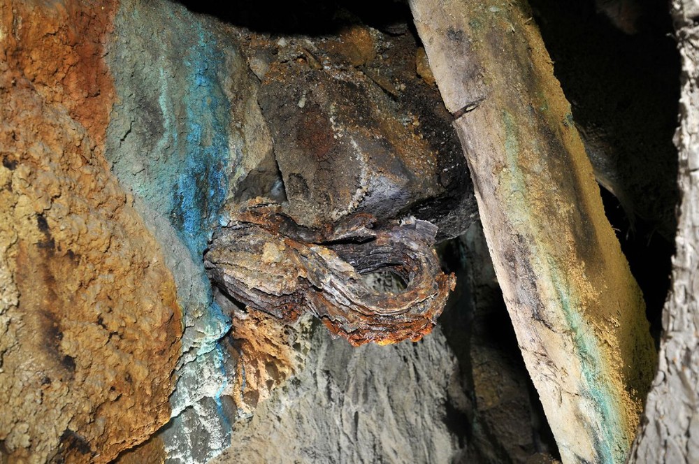 Delaminating iron eye bolt on the ore chute in level (under Stewart's stope), west off the Main Adit. [October 2012]