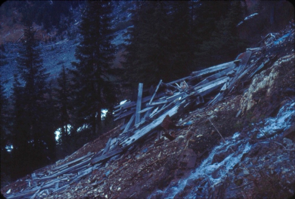 Ore bunker ruins below main adit - drainage from adit in foreground. Photo taken spring 1973.