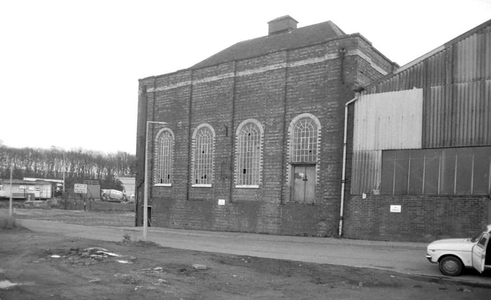 Side view of the 1870s engine house (looking South-east). It was built to house 2 horizontal-twin cylinder steam winders by John G. Stevenson & Co., Preston, Lancashire. Due to shaft sinking problems the engines were never really used and were sold to a Northern colliery in the 1890s. The building being converted to the electric power house. It survived the closure of the mine in 1967, being used as a council depot, until it was demolished in 1984.