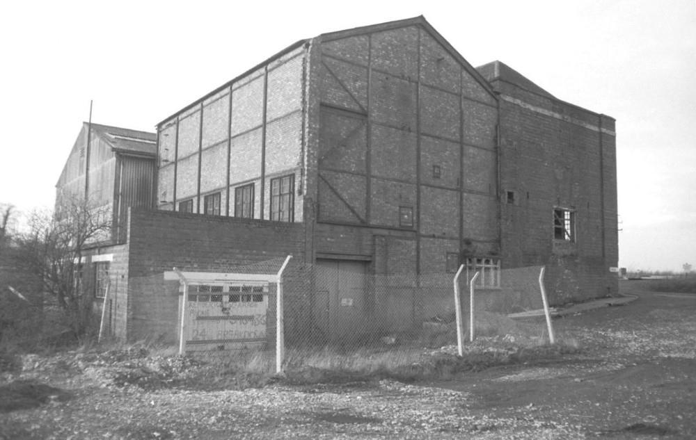 View looking north-west to the 1950s steel framed stores building (left) and the 1870s winding engine house, right (converted to the electric power house in the 1890s).