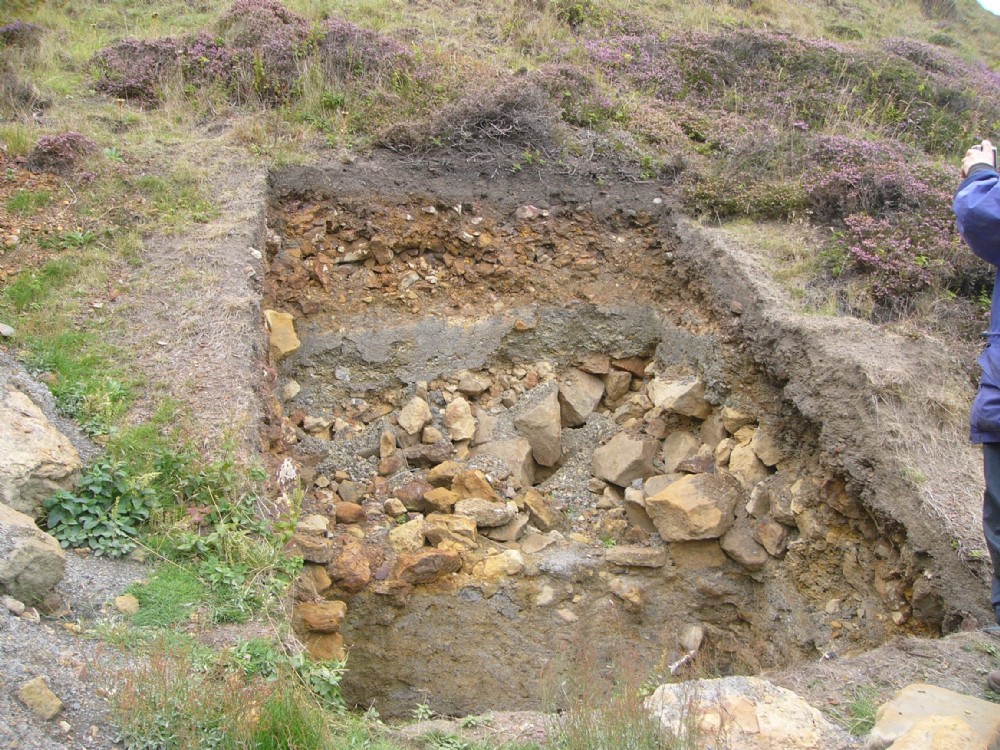 Recent archaeological dig attempting to discover purpose of this mound. Shows rubble base and ironstone cover of potential ironstone clamp.