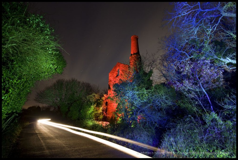 A composition of three lightpainted shots, blended to merge the respective colours.