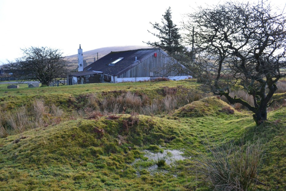 Trackbed of the 1858 Kilmar Railway on a low embankment across the view with disturbed ground associated with early workings on the South Phoenix/Wheal Prosper sett in the foreground. The low building was converted from a concrete reservoir constructed for the 1907-1911 South Phoenix reworking: it became the Minions Men's Institute and is now an outdoor centre for Truro School.