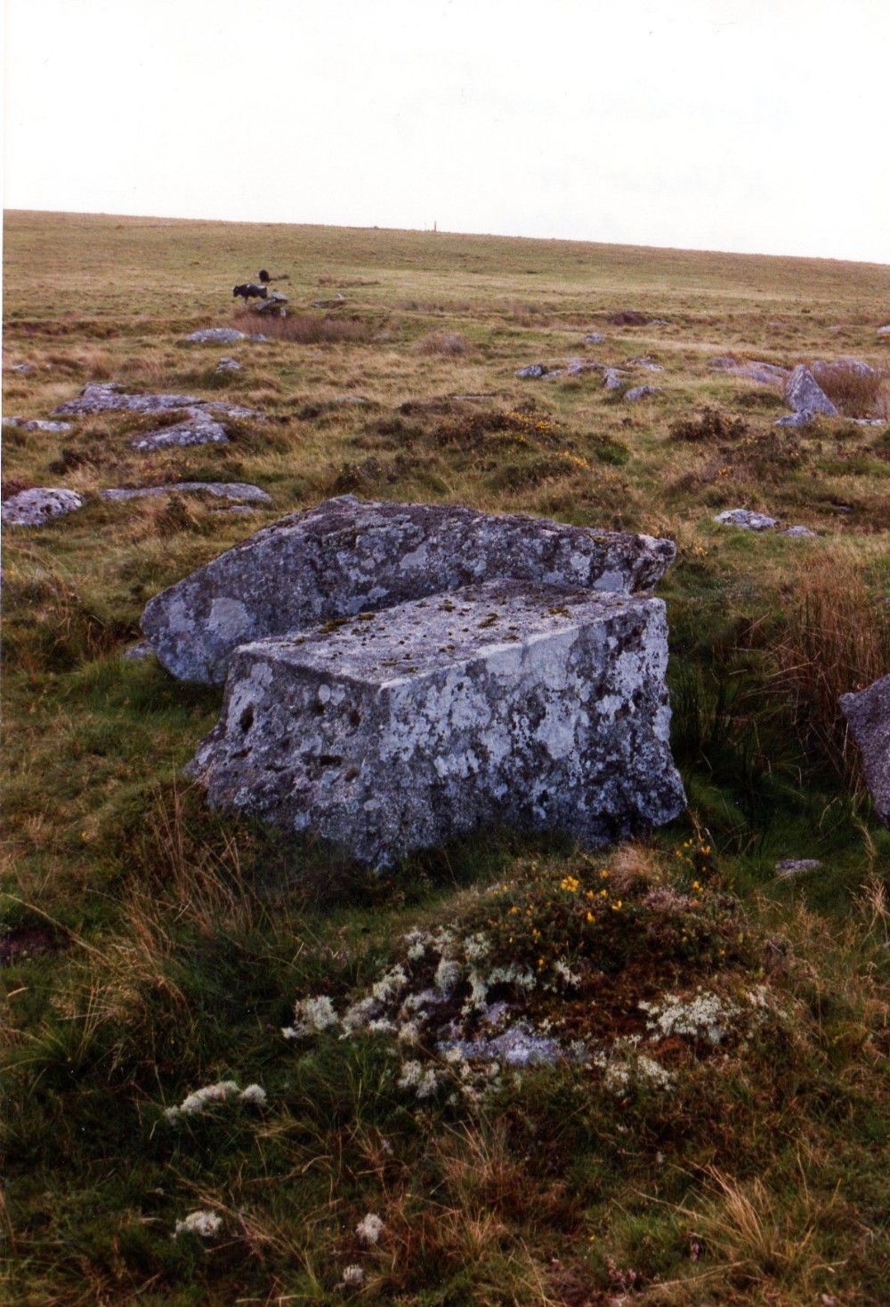 A prepared block of moorstone, abandoned on the moor. In the background can be seen a shallow ramp for loading granite blocks onto the Kilmar Railway