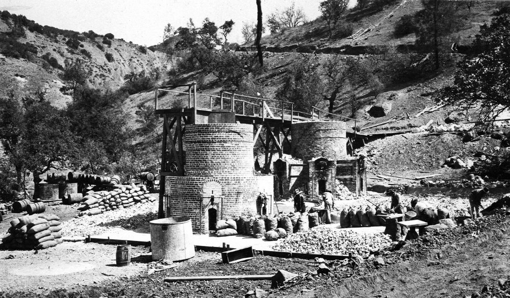 Kilns of Hoff-Price Magnesite Company, Larious Creek. Base for third kiln in lower left corner. San Benito County, California. September 18, 1917.