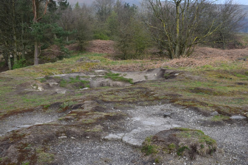 The grilled shaft is in the hollow. There are paved stones part buried in tip waste. The stones could be mounts for the headgear? The gin is located behind the shaft.