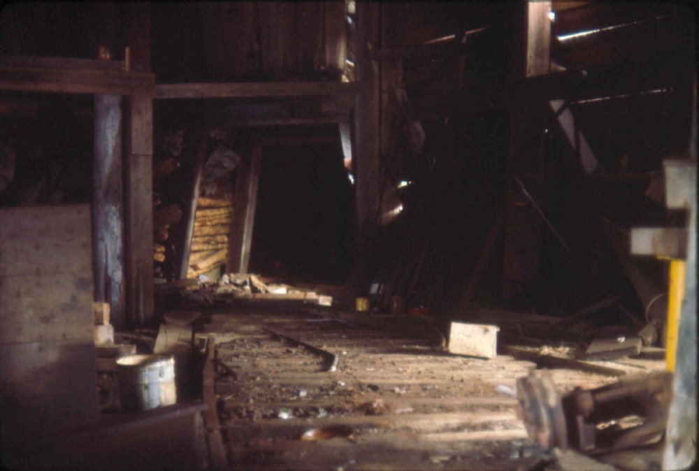 Inside upper tram terminal, looking toward main adit (slightly left of center) - photo taken spring 1977, after mill had been scrapped out.