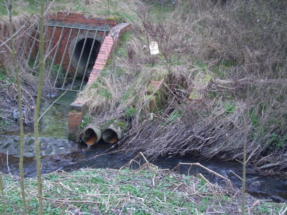 The smaller pipes or the pipe in the small brick revetment are likely more modern outlets for the sough. The large pipe is the stream culvert (Mar 2011)