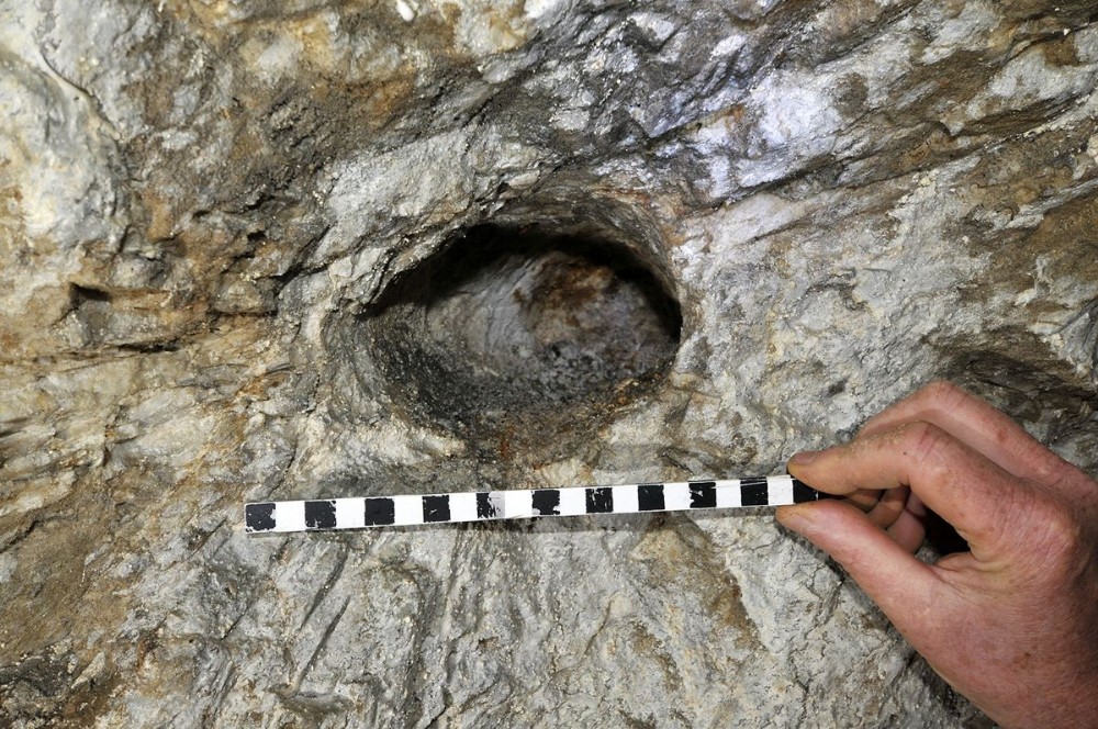 Large drill hole beside the doorway into a small heading with concrete bases and remains of a door frame, near the ore chute (under Stewart's stope). [October 2012]