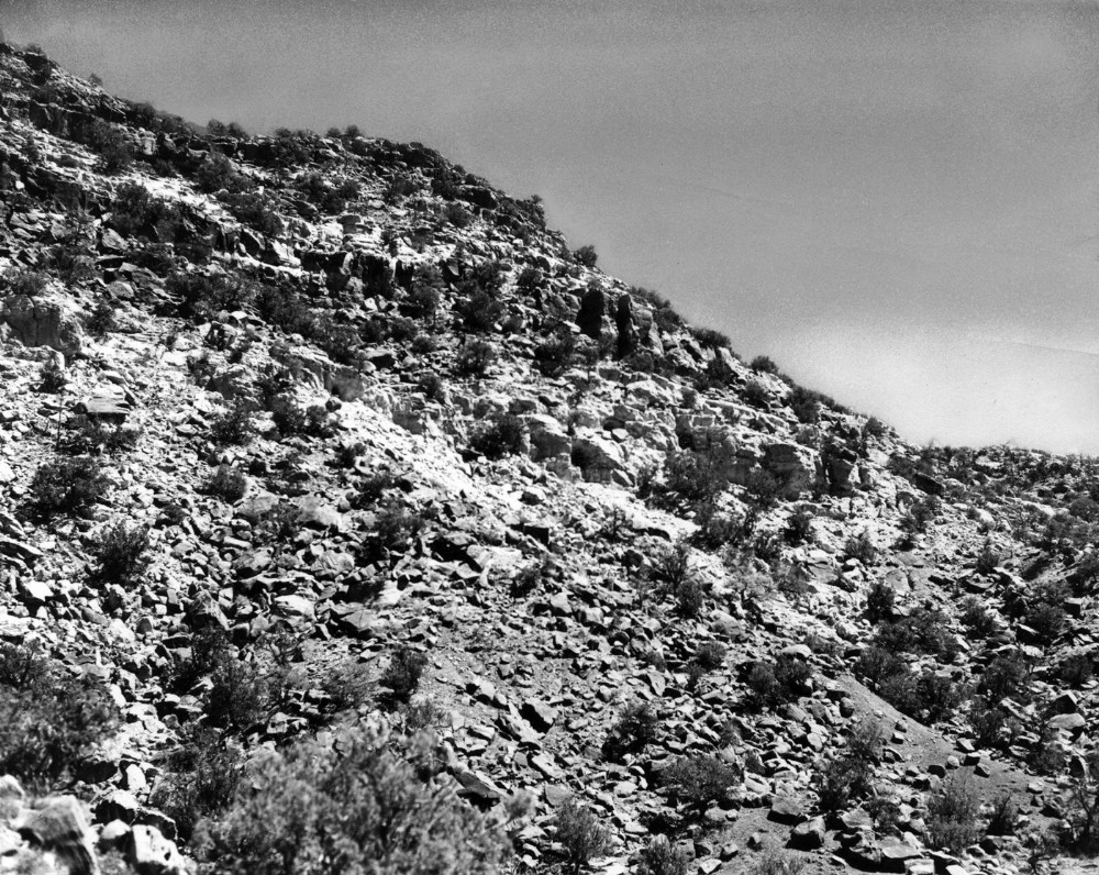 East was of Arroyo del Cobre. The adits of the Las Minas Jimmie copper mines are in the ledge of light-colored sandstone near the center of the picture. They are about 100 feet above the floor of the canyon and are probably the old copper mines describ ed by Professor Frank Knowlton, from which he collected fossil leaves in 1889. He also collected fossilized wood from a bed of shale overlying the bed of sandstone. New Mexico.