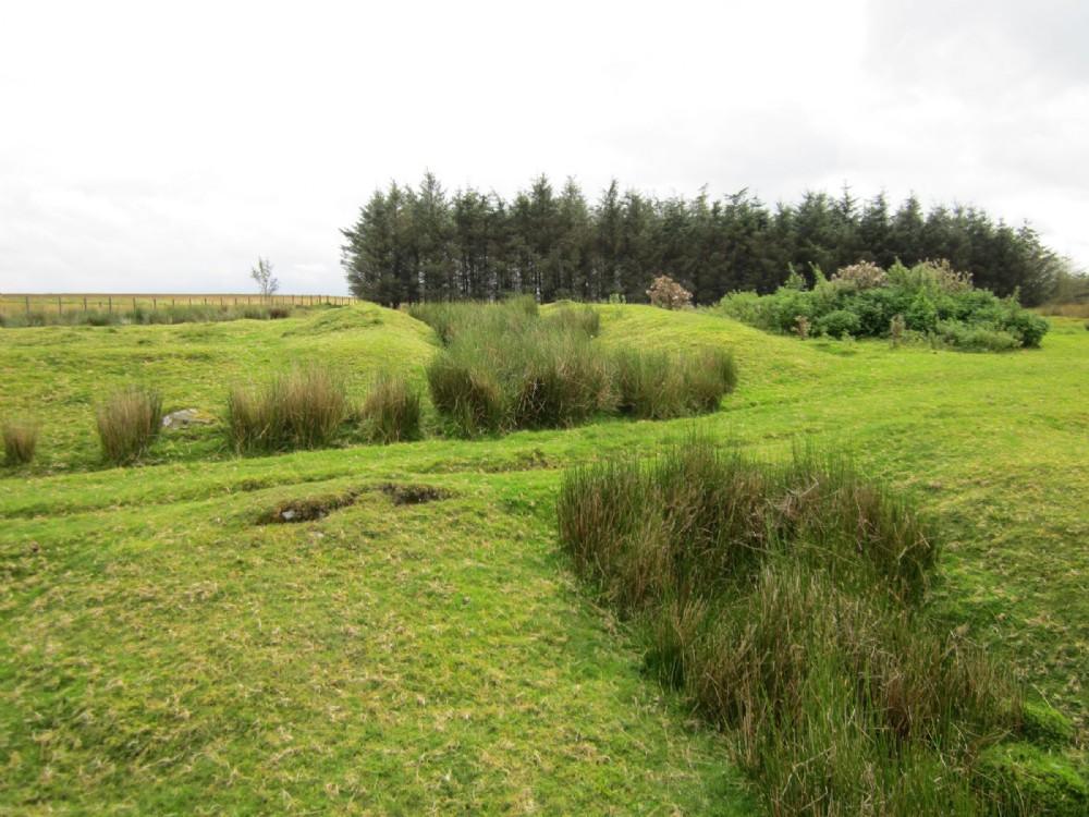 The eastern of the 2 channels carrying water presumably to the water pressure engine shaft. The source of this water is not apparent. David Bick (The Old Metal Mines of Mid-Wales, Part1, page 36) states "the leat that brought water is to the right of the track from Ffair Rhos to Esgair Mwyn". There is now no obvious trace of this leat and as both places lie downhill from Llwyn Llwyd neither one is the source.