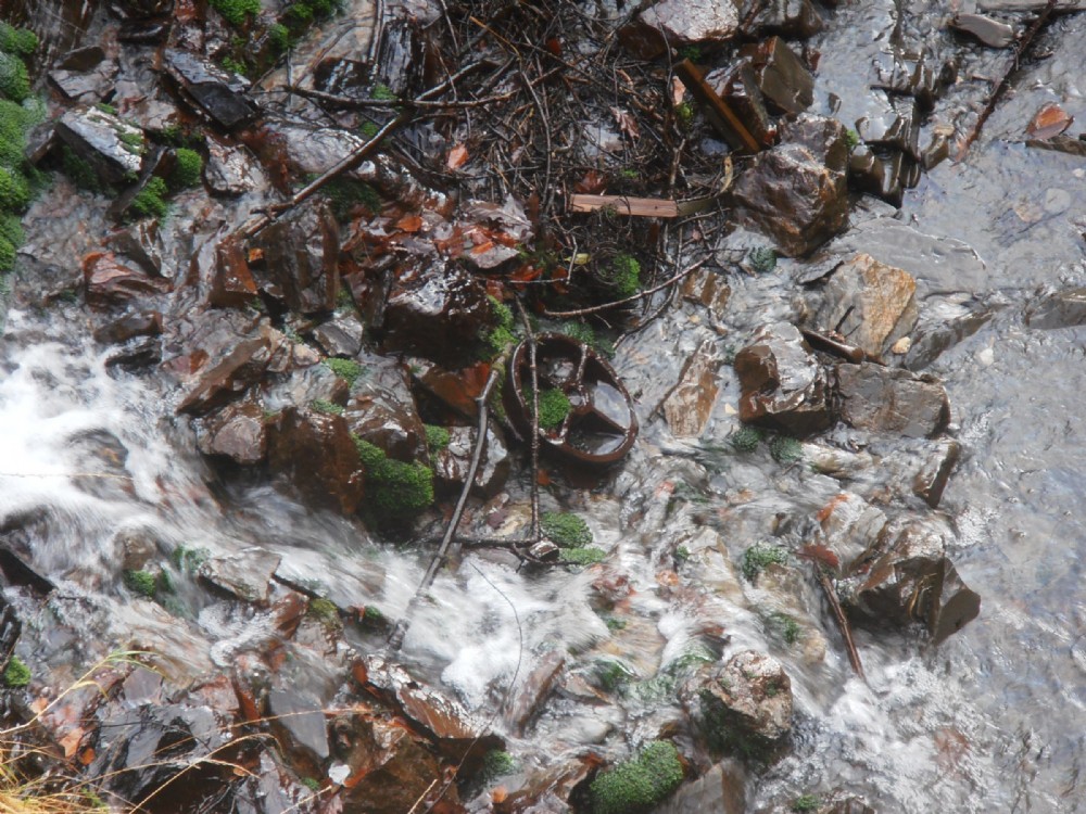 Looking down from Miner's bridge to an old double flanged wheel in the river. The waterfall is from the waterwheel and lefel fawr.