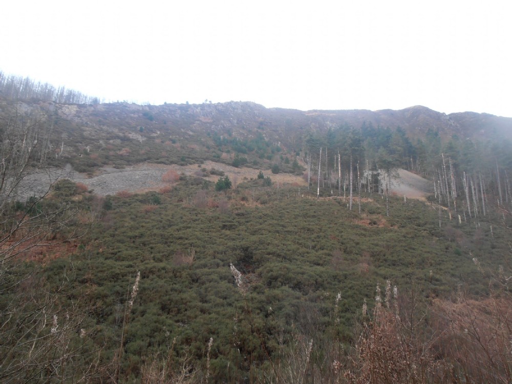 The main workings on the hillside. Lefel yr Uch mine is to the left over the ridge. The adit is on top of the tip to the right.