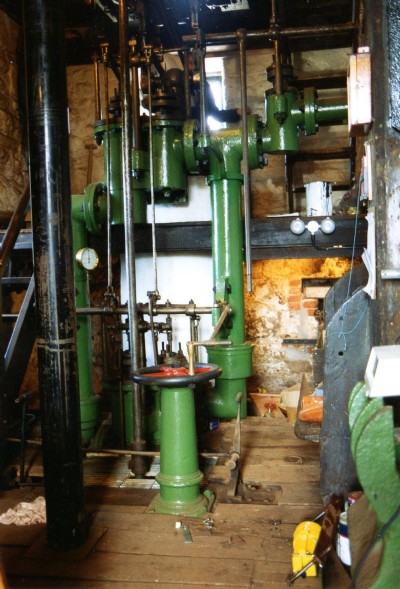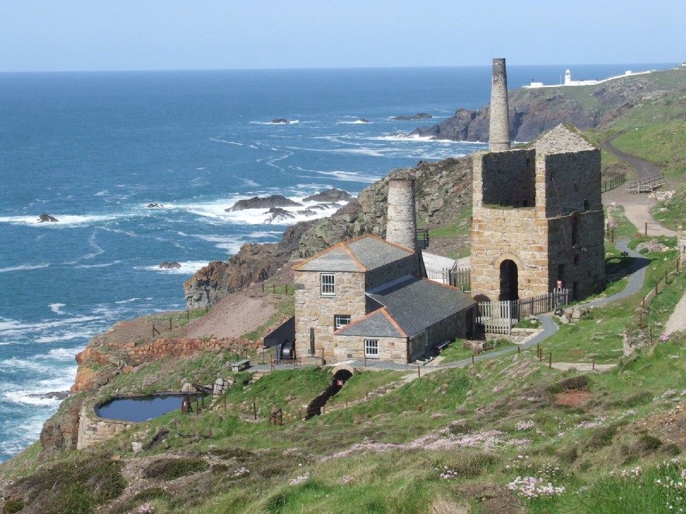 A general view looking at the collection of Winding and Pumping engines at the shaft head. The water for the Winding engine is held in the pond on the far left perched above the sea. Pendeen Lighthouse is on the cliff beyond.