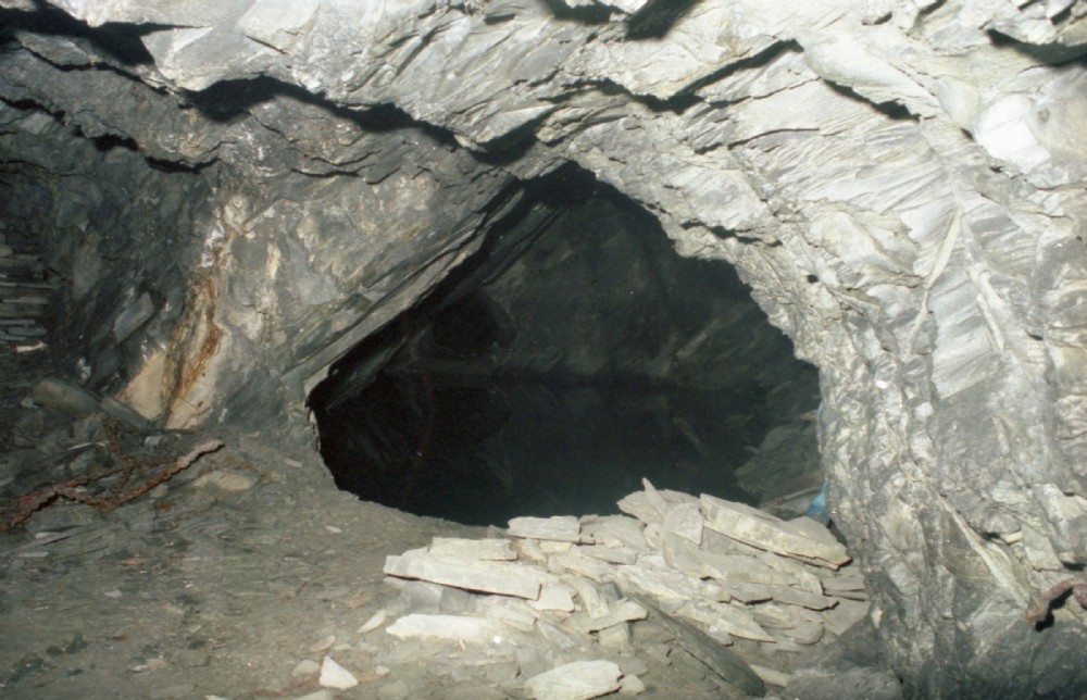 Looking through the level you can see across the chamber to the matching level on the other side in wall B2. It was at this moment we realised that we were looking back in time - the chamber and level you can see were not shown on the maps we were working to. This had to be long abandoned - and on enetering we could see why (you can see Will's foot disappearing round the corner!).