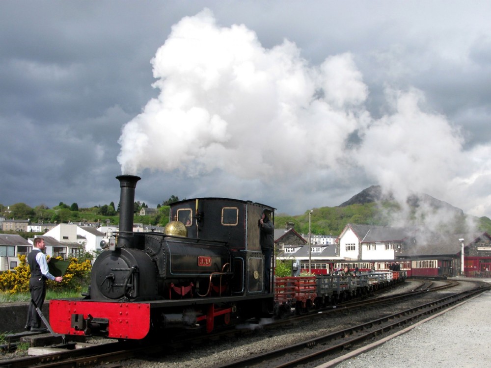 Steam locomotive Lilla (Hunslet, 1891, ex Cilgwyn and Penrhyn slate quarries) is about to take a rake of assorted empty slate waggons on to the main line and across the Cob.