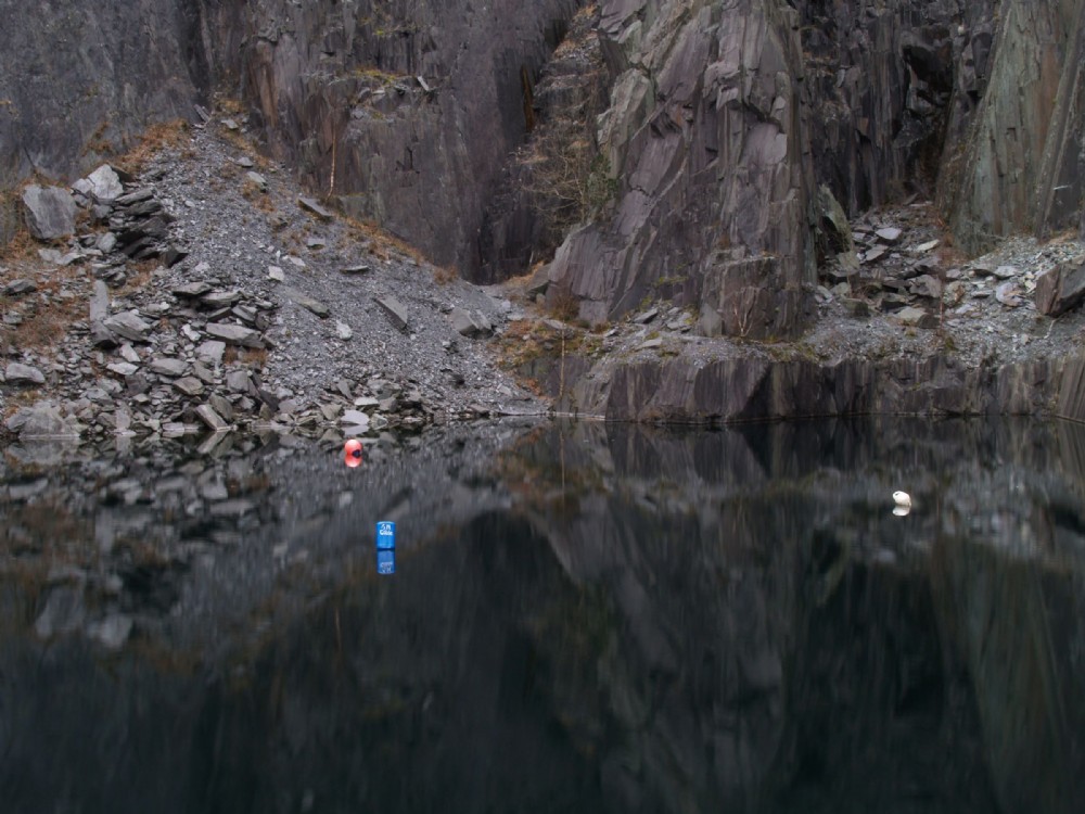 Vivian quarry, which is adjacent to the Gilfach Ddu complex is used as a diving centre. The buoys mark various underwater features used for training and recreational diving in this 19m. deep, flooded pit.