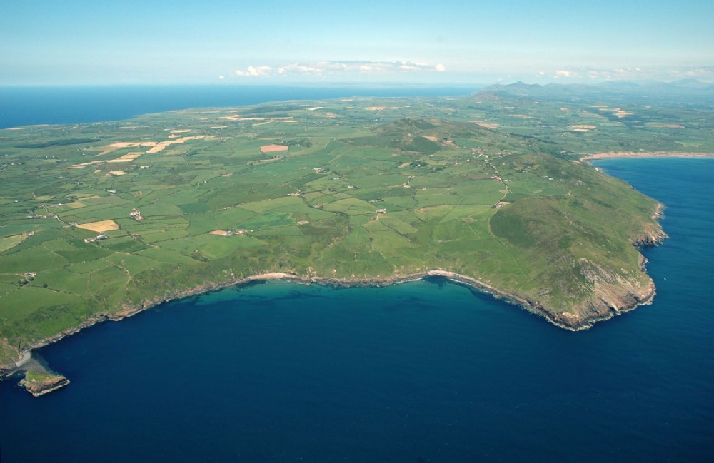 Maen Gwenonwy islet at left, Porth Ysgo beach and Nant y Gadwen in centre, Trwyn Talfarach at right, Porth Neigwl/Hell's Mouth beach far right, Anglesey and Yr Eifl in distance.