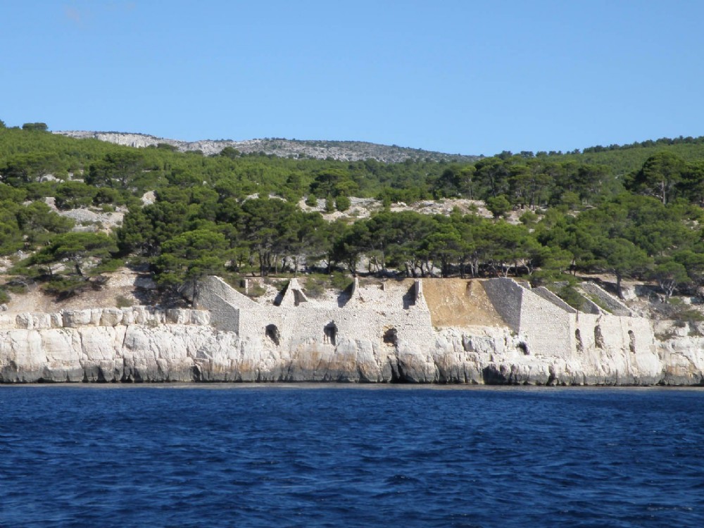 An offshore view of some of the loading facilities at the quarry on the Presqu'ile.