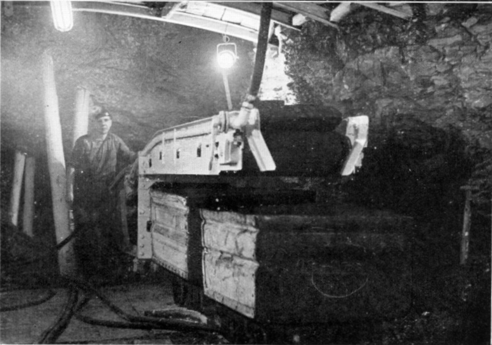 Caption: "The coal is loosened by mechanical cutters, and the men hack it out of the seam with picks and then shovel it on to a conveyor belt.... The conveyor carries the coal off and discharges it into the waiting pit-tubs as shown in this picture."