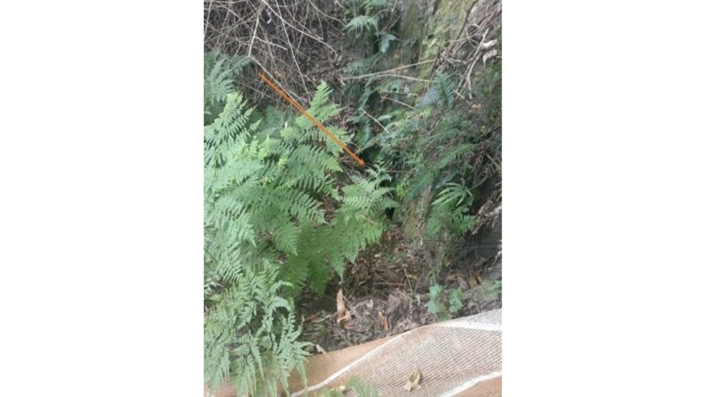 Hard to see but there is a body sized hole in ground between loose fill on left and rock arch on right. The arrow marks the spot. I guess it is accessible but not without a gas meter. Note orange safety netting in foreground to aid location. There are four short metal posts to which the netting was originally attached. An examination of the mine plan indicates an additional audit to the west of, and close to, the main adit but this was not located. There is at least one other adit to the east but this will have to wait for another trip!