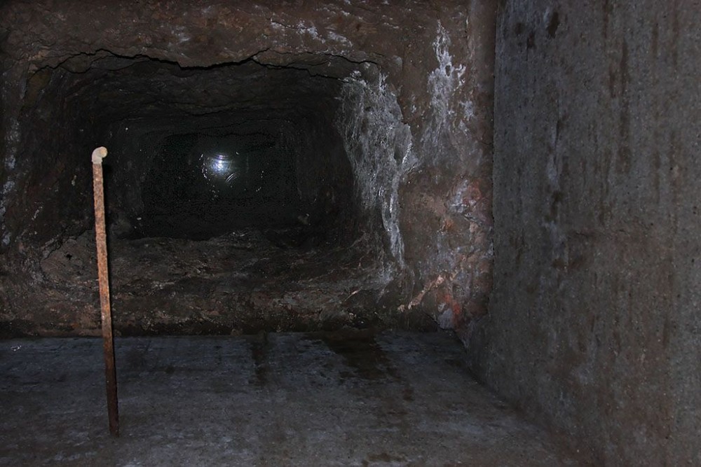This view shows the original rectangular shaft with the later concrete work resting upon the rock head. The water can be seen further down, presumably at sea level.
