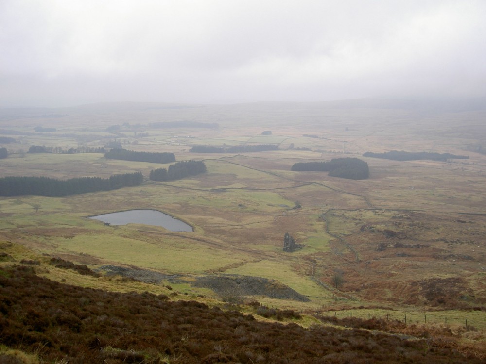 Large spoil heaps in the distance. There is an adit and shaft on the other side of the fence on the bottom right. The shaft is covered over with heather, and some rotten planks.