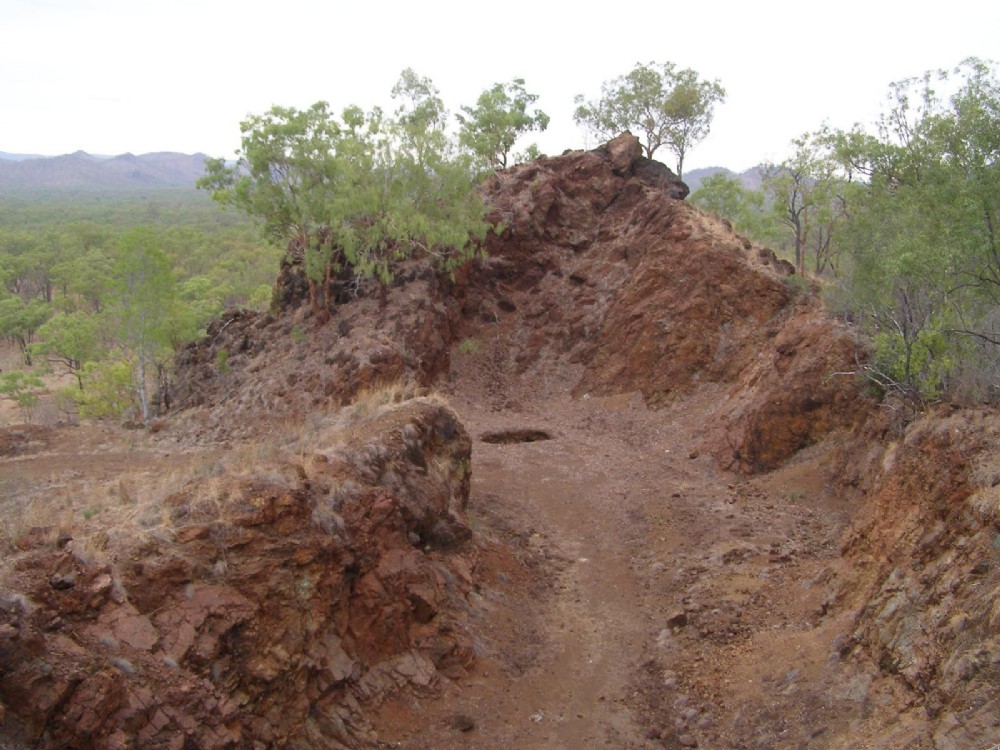 A view along the open-cut from the northwest. The northeasterly dip of the skarn unit is visible.