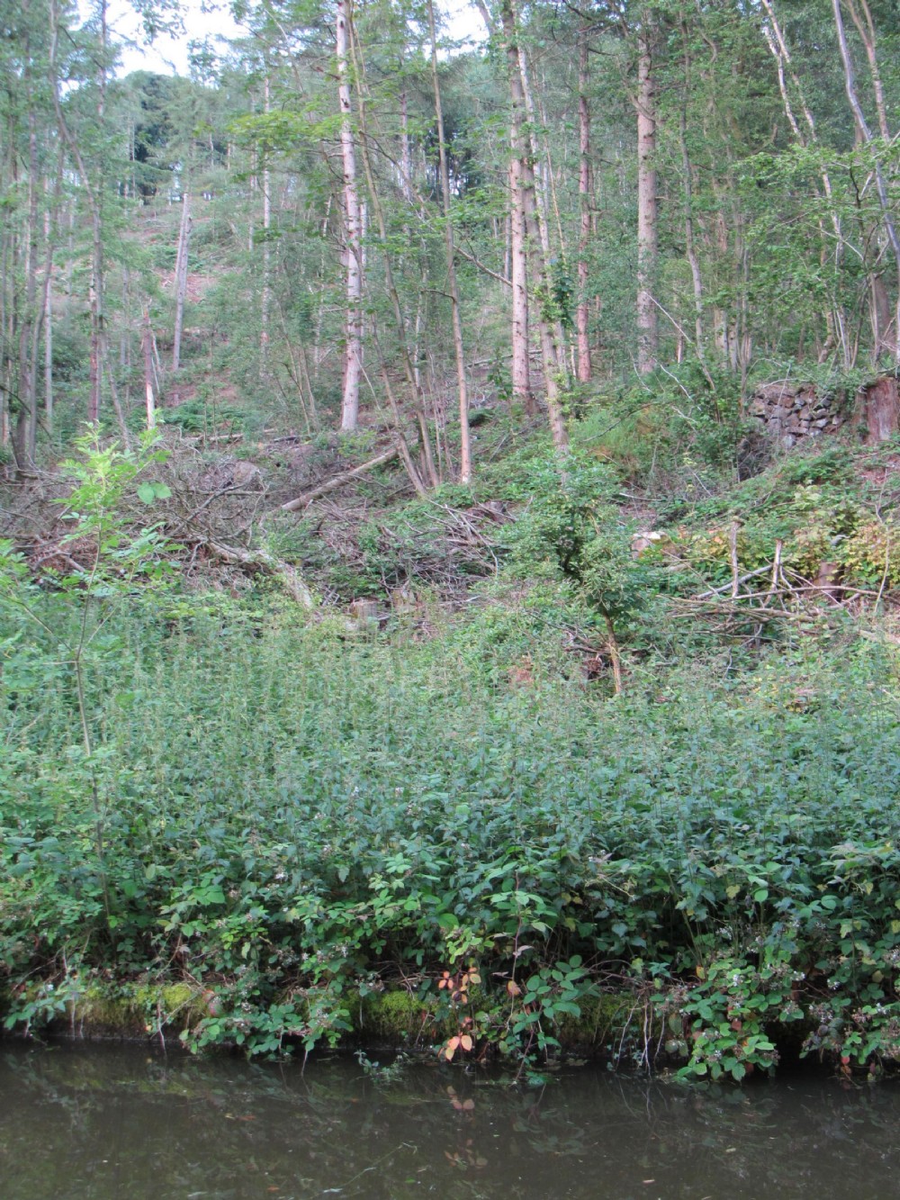 Looking up the incline.The tramway passed below and to the left of the stone built abutment just visible in the photograph. The incline terminated at a wharf on the Caldon Canal at SK016480. The incline is very overgrown. Nothing left of the wharf either.