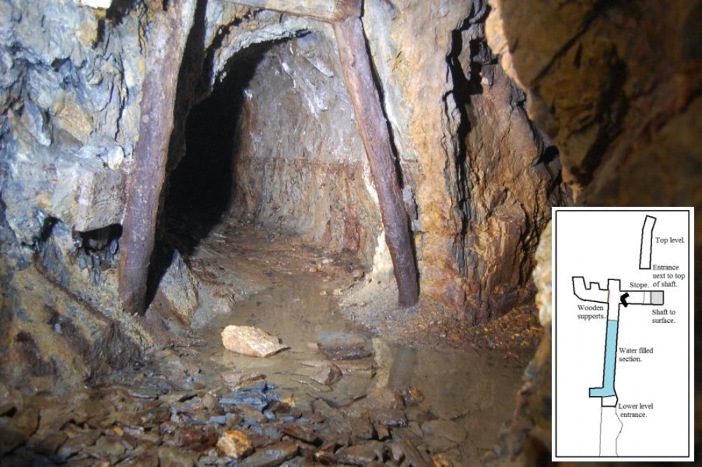 Roof supports with less than ten metres of mine tunnel beyond. A stope is to the south with a shaft to the surface beyond. To the west is the water filled entrance.