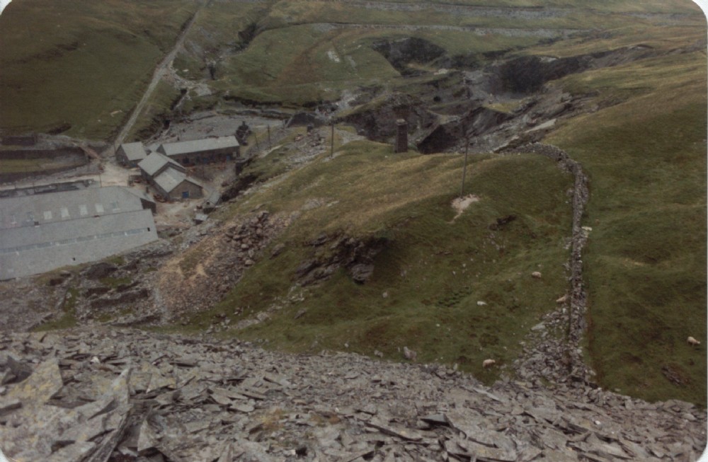 Viewed from a Diffwys tip looking North. In the distance is the David Jones' Quarry with the tunneller level visible just to the right of the chimney.