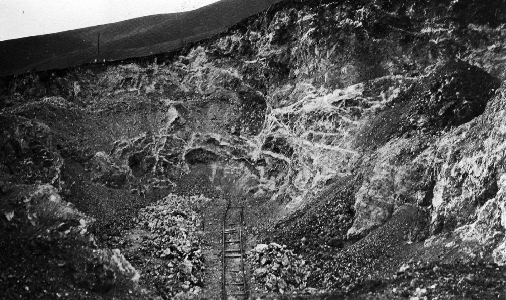 H.C. Warwick magnesite mines two and one-half miles northeast of Madrone. Inside large pit showing character of deposit near surface. Santa Clara County, California. September 4, 1917.