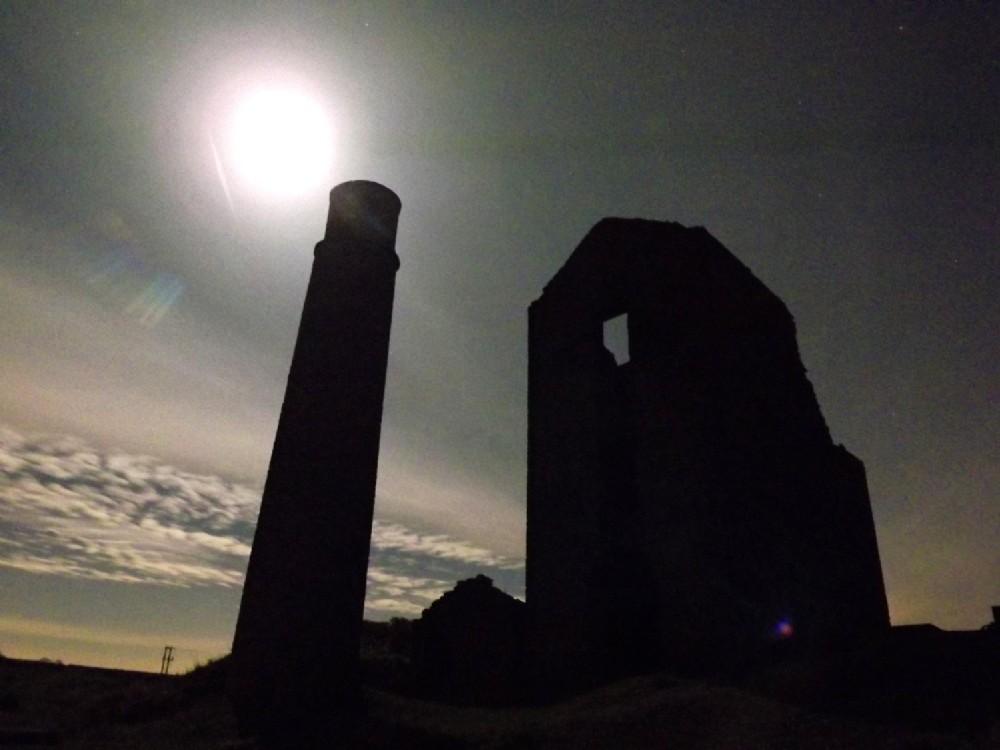 View of the moon casting shadows of the engine house & chimney.