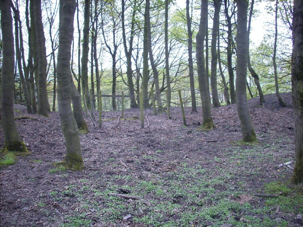 Main engine shaft (fenced and sleepered) and possible gin circle (to hillock on right) (24 April 2009)